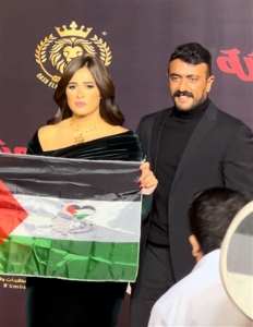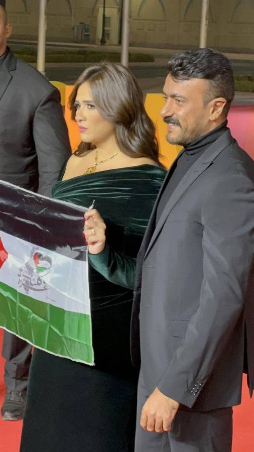 وحرصت ياسمين على إظهار تضامنها مع القضية الفلسطينية خلال مرورها وزوجها أحمد العوضي على السجادة الحمراء للمهرجان برفع العلم الفلسطيني.