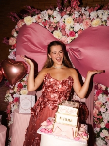 تألقت نجمة مواقع التواصل الاجتماعي البلوغر #أليونا بفستان باللون الزهري الداكن مطرزًا بالورود احتفالًا بعيد ميلادها، ونشرت أليونا صورًا عبر حسابها في إنستغرام برفقة زوجها يزن عبويني مع قالب من الكيك وسط ديكور بثيم الورود والبالونات بدرجات اللون الزهري الفاتح والغامق.