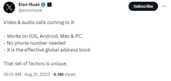 إيلون ماسك في منشور له، إن الشركة ستعمل على تفعيل خاصية مكالمات الفيديو والصوت دون الحاجة إلى استخدام رقم هاتف.