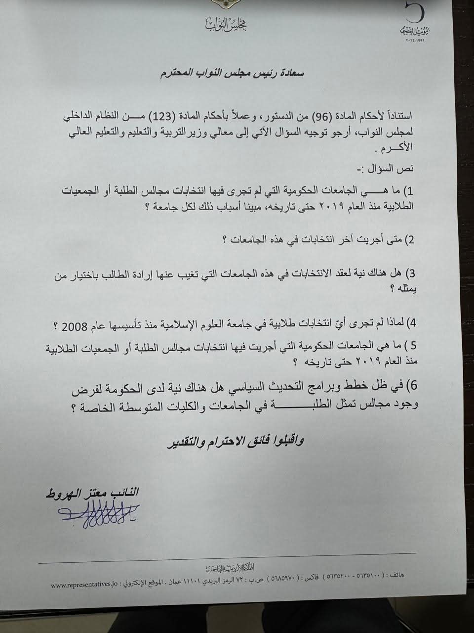 الرأي نيوز -  فتح النائب معتز الهروط النار على وزارة التربية والتعليم والتعليم العالي بوابل من الاسئلة النيابية حول انتخابات مجالس الطلبة .