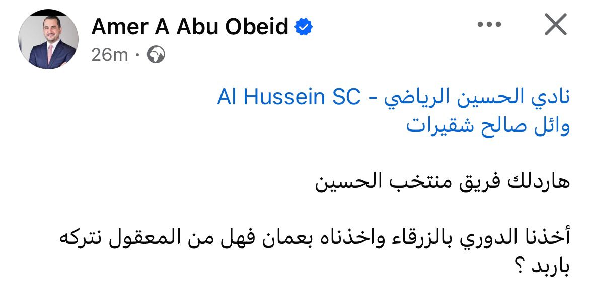 وقال أبو عبيد في منشور عبر صفحته بموقع التواصل الاجتماعي فيسبوك له: هاردلك فريق ومنتخب الحسين، أخذنا الدوري بالزرقاء وأخذناه بعمّان، فهل من المعقول نتركه باربد".