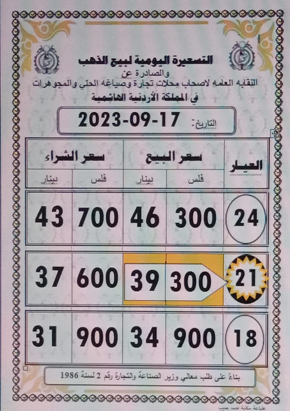 أما سعر بيع غرام الذهب عيار 18 فقد بلغ 34.9 دينارًا للبيع للمواطنين مقابل 31.9 دينارًا للشراء منهم