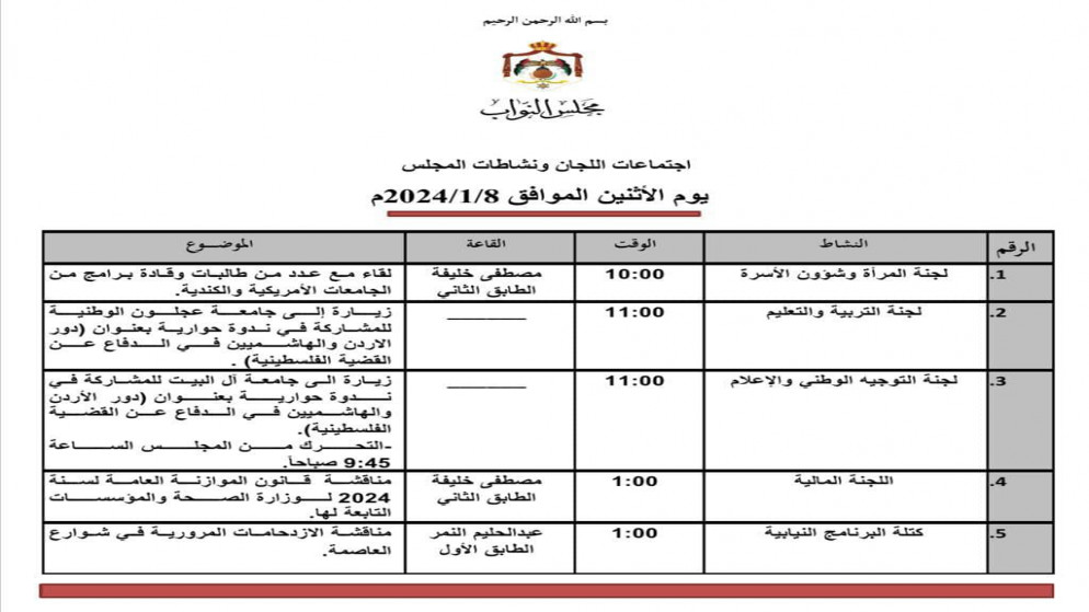 العامة للسنة المالية 2024، لوزارة الصحة والمؤسسات التابعة لها، فيما تجتمع لجان نيابية مختصة في مجلس النواب لمناقشة قضايا عدة.