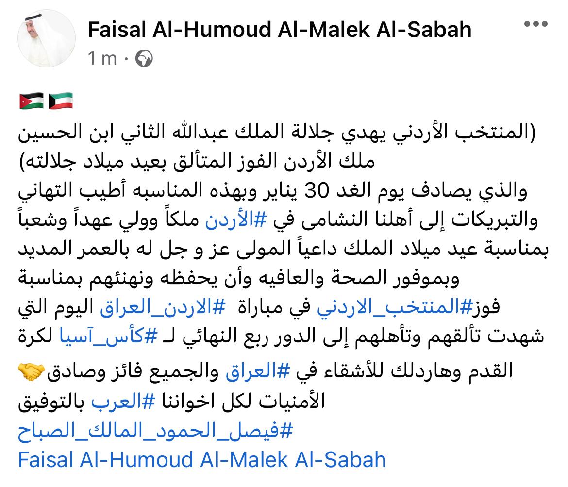 الرأي نيوز  - هنأ المستشار في الديوان الأميري الكويتي الشيخ فيصل الحمود المالك الصباح جلالة الملك عبدالله الثاني بن الحسين والشعب الاردني بعيد ميلاده الميمون، وفوز منتخب النشامى على نظيره العراقي والتأهل إلى ربع نهائي كأس آسيا.