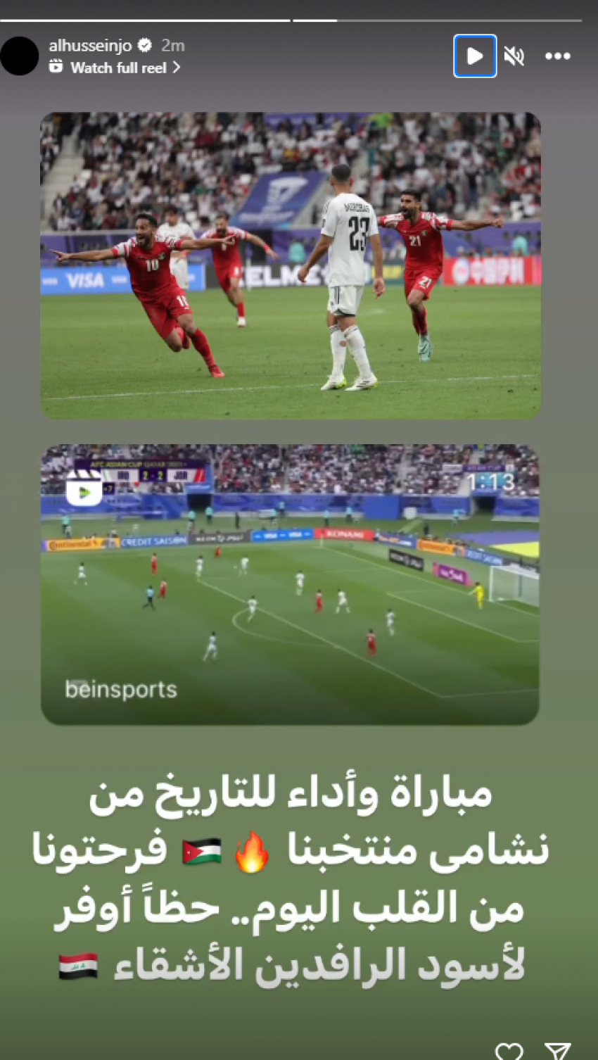 وقال سموه عبر خاصية الستوري في صفحته الرسمية على انستجرام: "مباراة وأداء للتاريخ من نشامى منتخبنا، فرحتونا من القلب اليوم، حظًا أوفر لأسود الرافدين الأشقاء".
