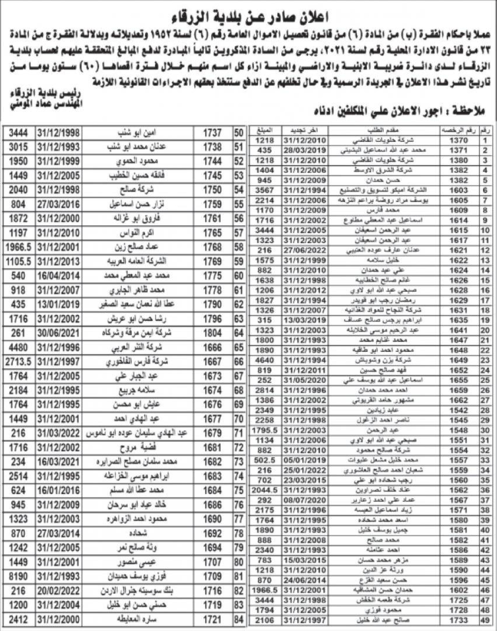 بلدية الزرقاء تطالب مواطنين بدفع أموال (أسماء)