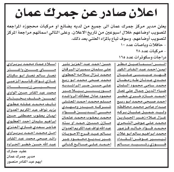 الراي نيوز - أعلن مركز جمرك عمان اليوم الأحد عن أسماء ممن لديهم بضائع ومركبات محجوزة لدى المركز، ضرورة مراجعة المركز لتصويب أوضاعهم.