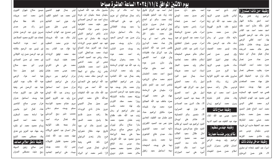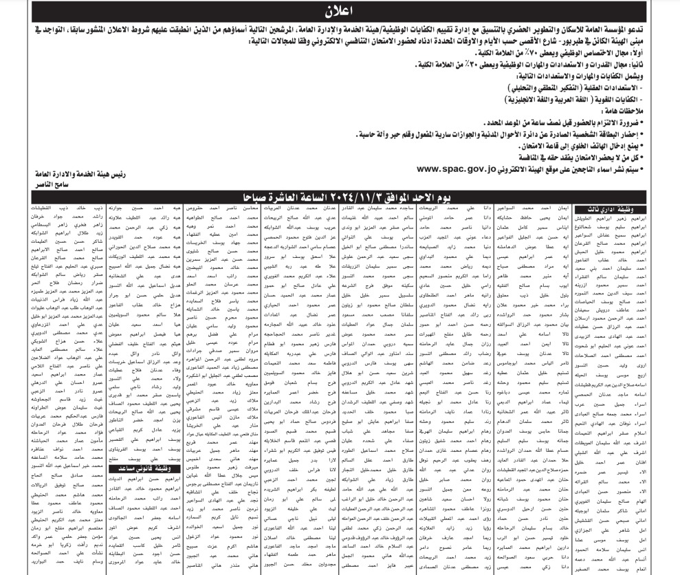 دعت المؤسسة العامة للاسكان والتطوير الحضري بالتنسيق مع إدارة تقييم الكفايات الوظيفية/هيئة الخدمة والادارة العامة، المرشحين التالية اسماؤهم من الذين انطبقت عليهم شروط الاعلان المنشور سابقا، الى التواجد في مبنى الهيئة في طبربور ، وذلك حسب الايام والاوقات المحددة لحضور الامتحان التنافسي الالكتروني.