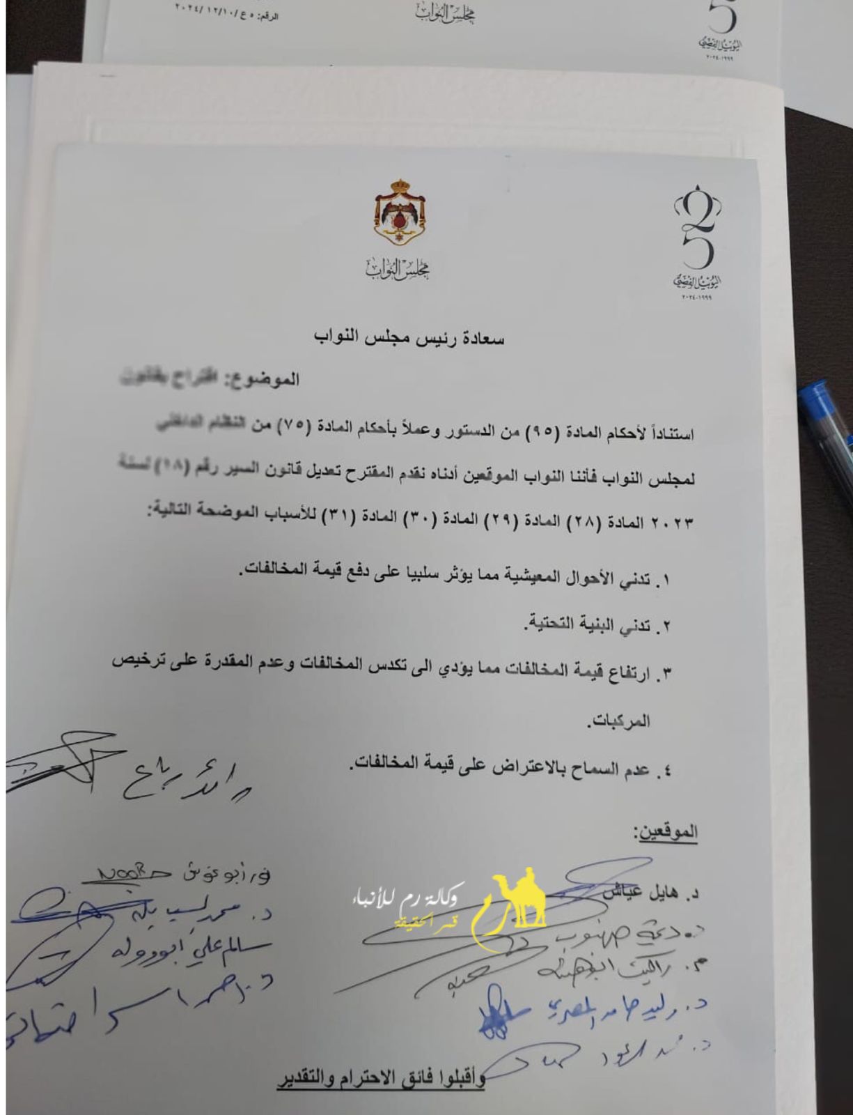 الرأي نيوز -  قدم عدد من النواب، اليوم الأربعاء، مقترح تعديل لقانون السير رقم 18 لسنة 2023، حيث تبناه النائب الدكتور هايل عياش ووقع عليها 9 نواب.