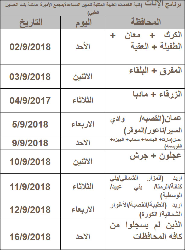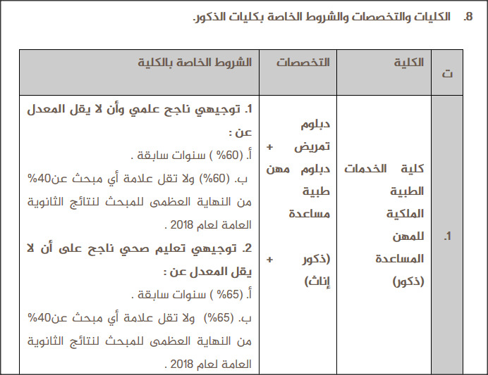 ب. ذكور + إناث من حملة شهادة الثانوية العامة ناجح لحساب كلية الخدمات الطبية الملكية للمهن المساعدة –مجمع الأميرة عائشة بنت الحسين الطبي وبشروط معينة لهذا العام 2018 .