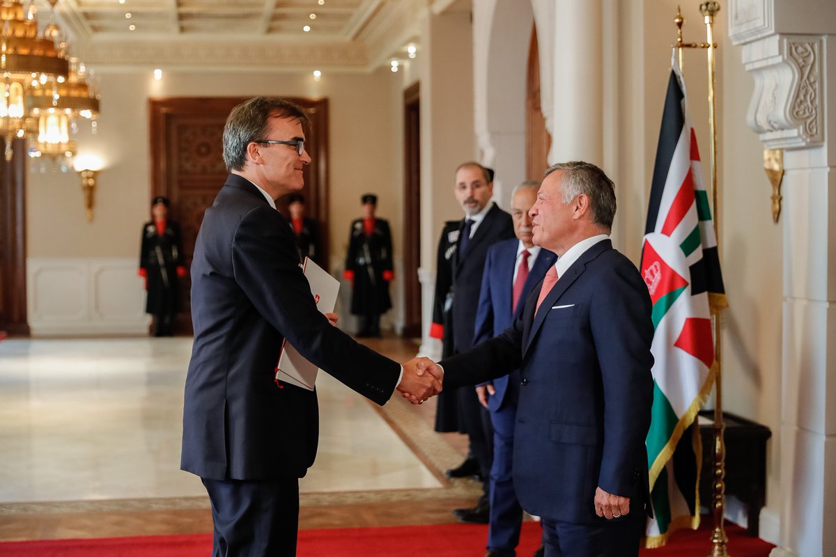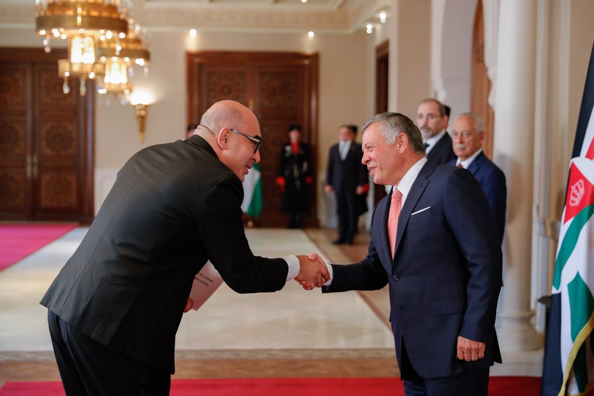 وحضر مراسم تقبل أوراق اعتماد السفراء، رئيس الديوان الملكي الهاشمي، ووزير الخارجية وشؤون المغتربين. بترا