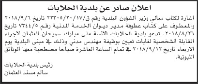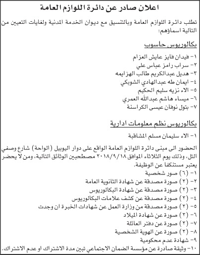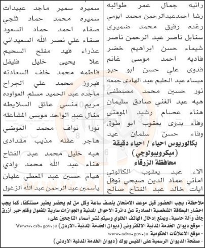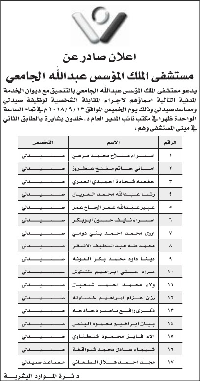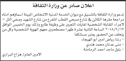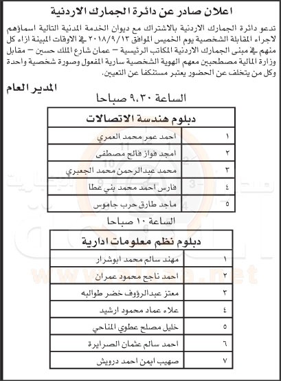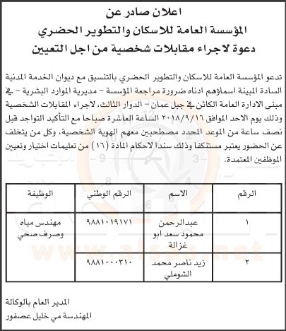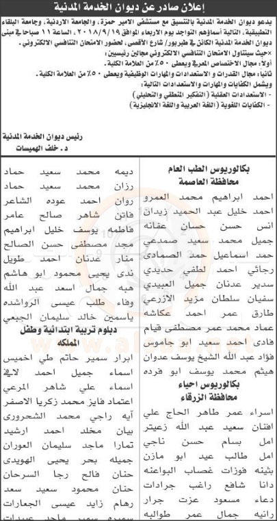 دعا ديوان الخدمة المدنية بالتعاون مع مختلف الوزارات والمؤسسات الحكومية، التالية اسماؤهم لاجراء المقابلات الشخصية لغايات التعيين.