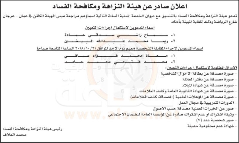 - دعت هيئة النزاهة ومكافحة الفساد بالتنسيق مع ديوان الخدمة المدنية التالية اسماؤهم لمراجعة مبنى الهيئة وذلك للغاية المبينة ادناه: