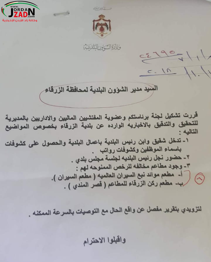 - استهجن رئيس بلدية الزرقاء المهندس علي ابو السكر قيام وزارة الشؤون البلدية بتشكيل لجنة تحقيق باخباريات واردة عن بلدية الزرقاء خلال اجازتة الرسمية .