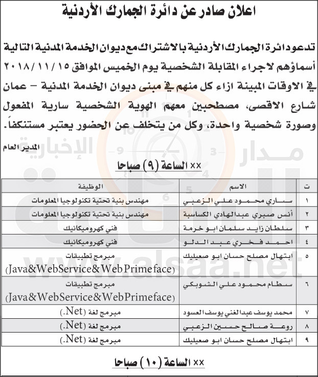 - دعت دائرة الجمارك الأردنية بالاشتراك مع ديوان الخدمة المدنية التالية اسماؤهم لاجراء المقابلة الشخصية.