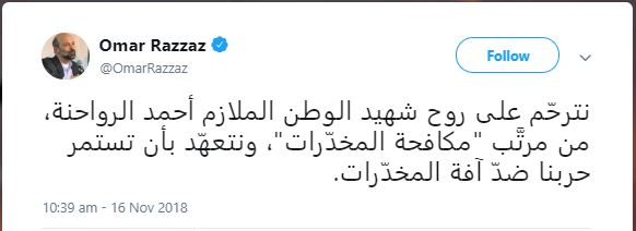 وقال الرزاز في تغريدة عبر حسابه الخاص على موقع التواصل الأجتماعي ‘‘تويتر‘‘ الجمعة: ' نترحّم على روح شهيد الوطن الملازم أحمد الرواحنة، من مرتَّب 'مكافحة المخدّرات'، ونتعهّد بأن تستمر حربنا ضدّ آفة المخدّرات'. الغد
