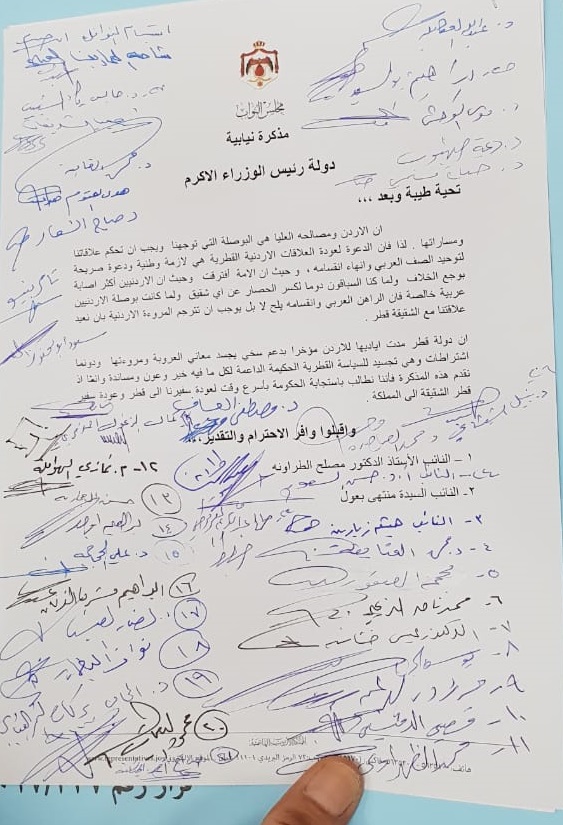 كما طالبت المذكرة بإعادة السفير الأردني إلى العاصمة القطرية الدوحة وإعادة السفير القطري إلى العالصمة عمان.