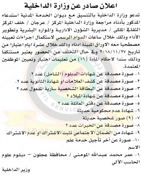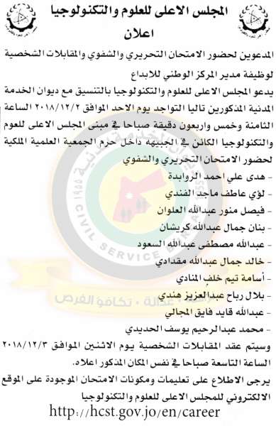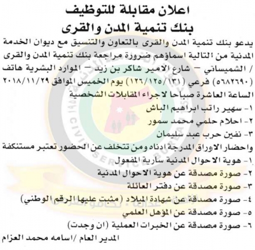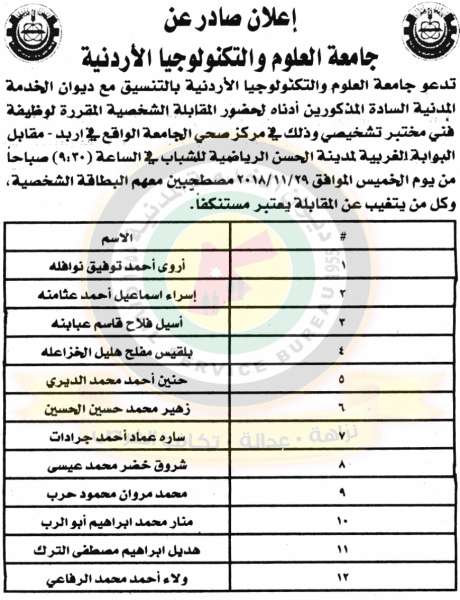 دعا ديوان الخدمة المدنية بالتعاون مع مختلف الوزارات والمؤسسات الحكومية، التالية اسماؤهم لاجراء المقابلات الشخصية وعقد الامتحان التنافسي لغايات التعيين.