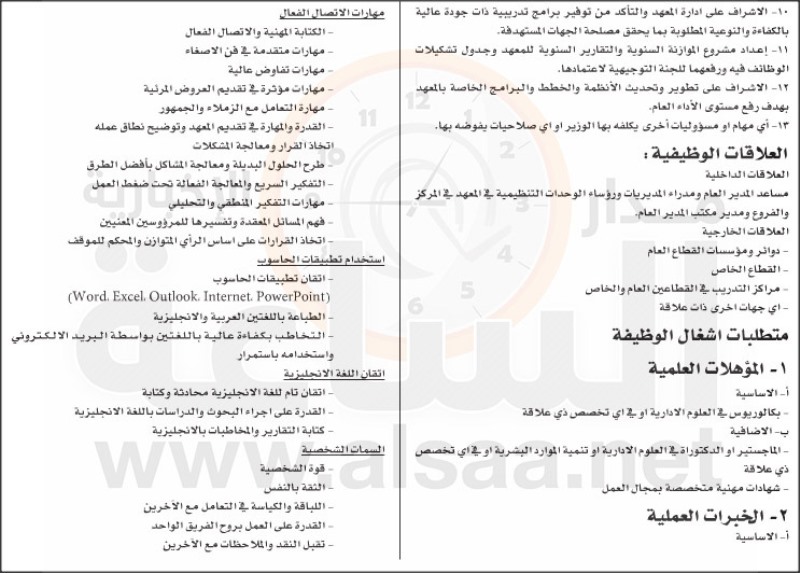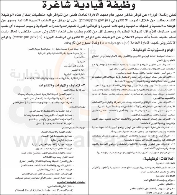 أعلنت رئاسة الوزراء اليوم الأربعاء عن توافر شاغر مدير عام معهد الإدارة العامة.