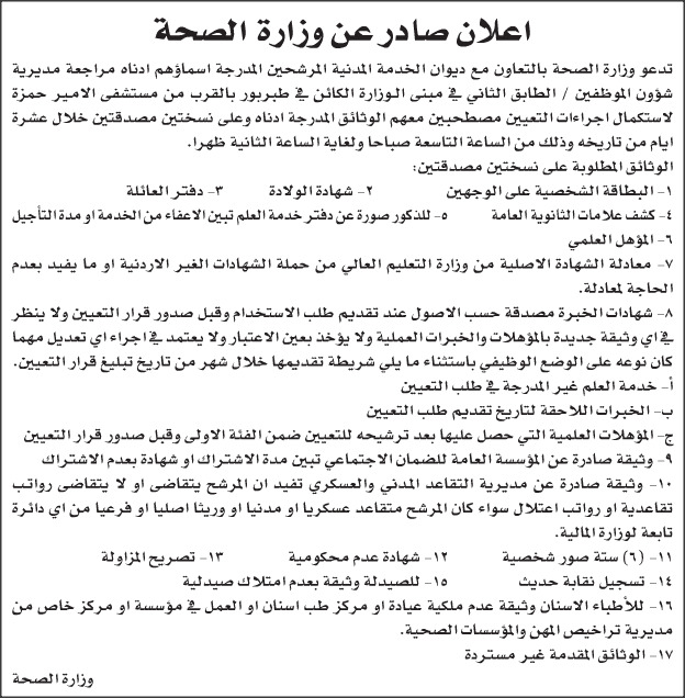 دعت وزارة الصحة بالتعاون مع ديوان الخدمة المدنية عدد من الاطباء والممرضين للتعيين .