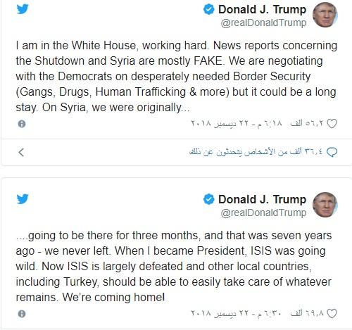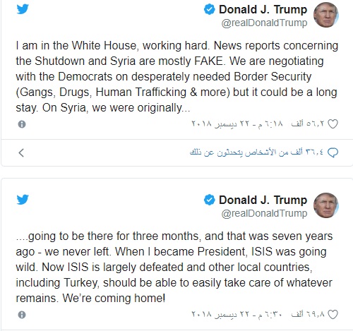 ووصف ترامب التقارير الإخبارية المتعلقة بإغلاق الحكومة وتلك المتعلقة بسوريا بـ”الوهمية”، قائلا "أنا الآن في البيت الأبيض أحاول التفاوض مع الديمقراطيين حول أمن الحدود (العصابات والمخدرات والإتجار بالبشر) وغير ذلك الكثير، لكن قد تكون هناك فترة طويلة.