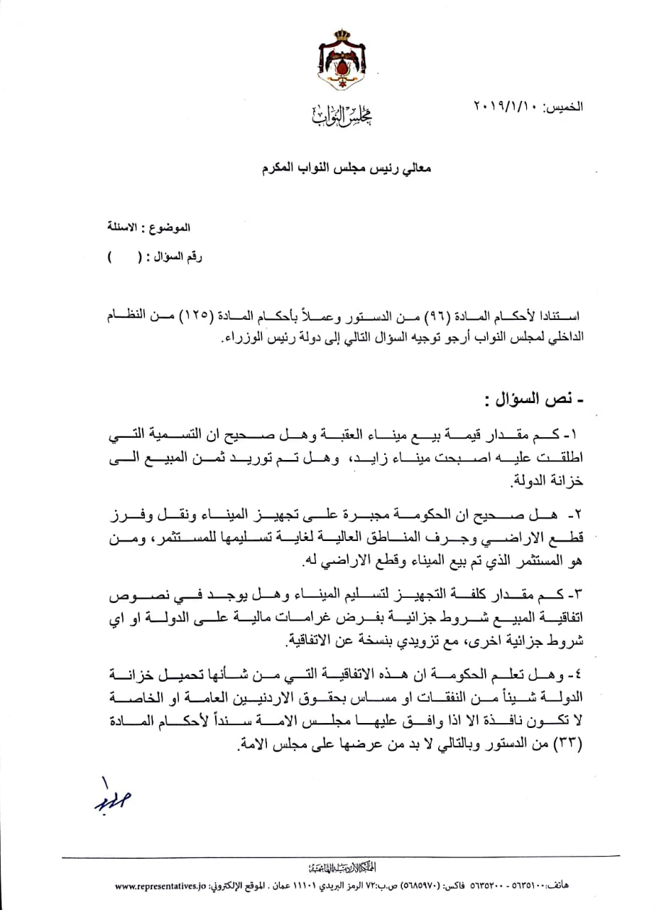 أمطر النائب المحامي صالح العرموطي ، الحكومة بوابل من الأسئلة حول بيع ميناء العقبة ، وتضمنت أسئلته قيمة البيع ، وهل تم توريد القيمة إلى خزينة الدولة ، وعن نصوص وشروط الاتفاقية ، منوها إلى أن أي اتفاقية بيع أو شراء تكلف الخزينة مبالغ مادية لا بد من موافقة مجلس النواب عليها .