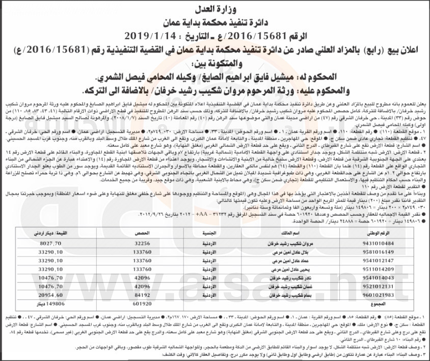 - صدر عن دائرة تنفيذ محكمة بداية عمان إعلان بيع (رابع) بالمزاد العلني في قضية تنفيذية متكونة بين المحكوم له: ميشيل الصايغ والمحكوم عليه: ورثة المرحوم مروان شكيب خرفان/بالاضافة الى التركة. وذلك حسب الرهن المطروح للتنفيذ في قطع اراضٍ.