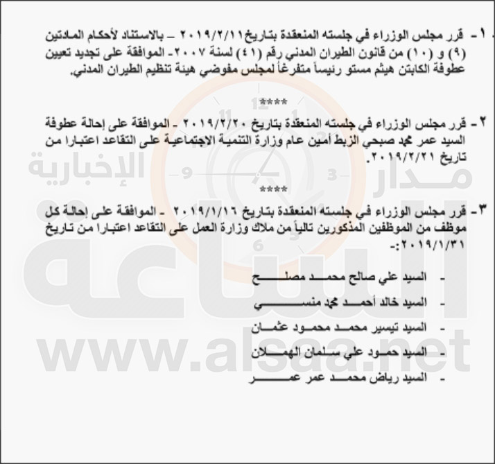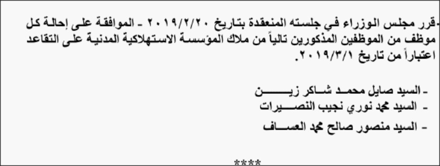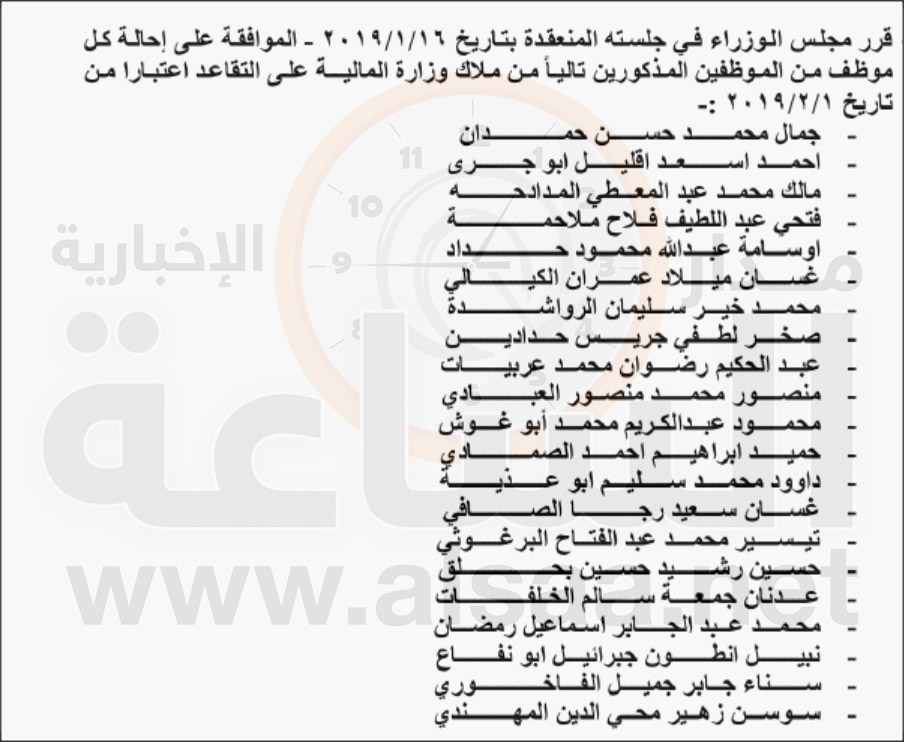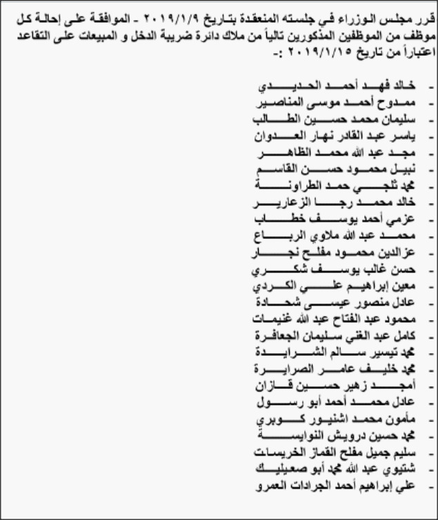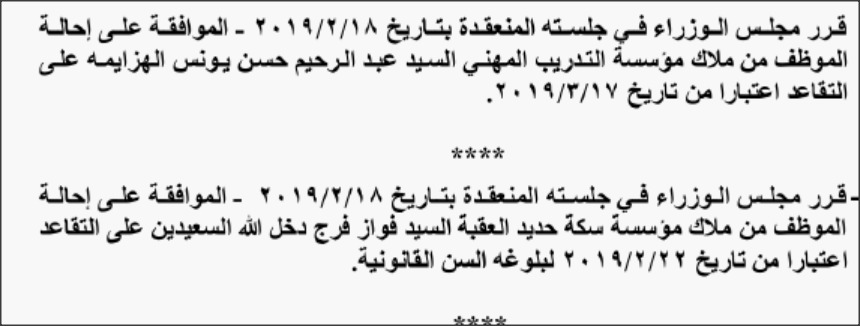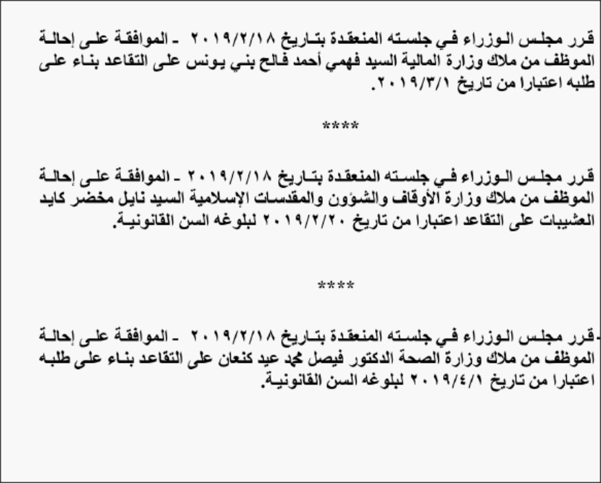 - قرر مجلس الوزراء إحالة موظفين في عدد من الوزارات والدوائر إلى التقاعد.