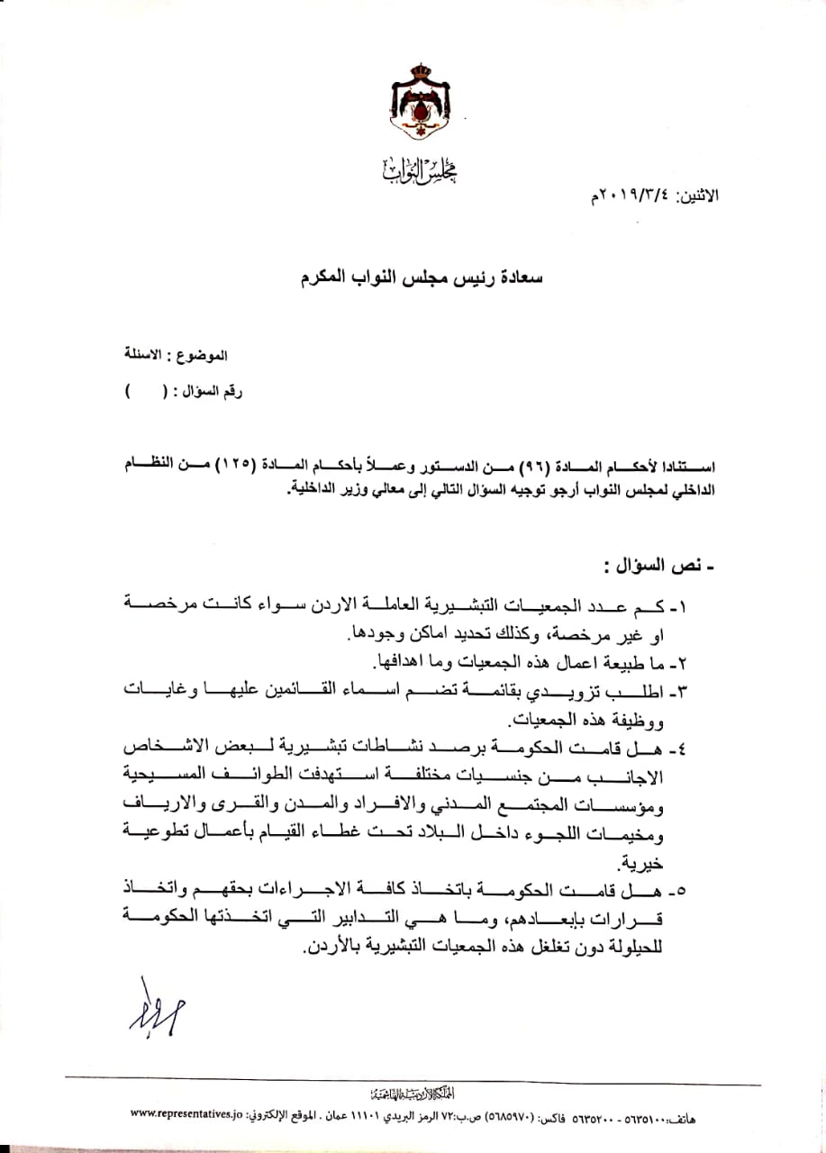 وجه النائب صالح العرموطي سؤالا للحكومة يتعلق بالجمعيات التبشيرية العاملة الاردن سواء كانت مرخصة او غير مرخصة وطبيعة عملها واهدافها ونشاطاتها وتاليا نص الاسئلة:
