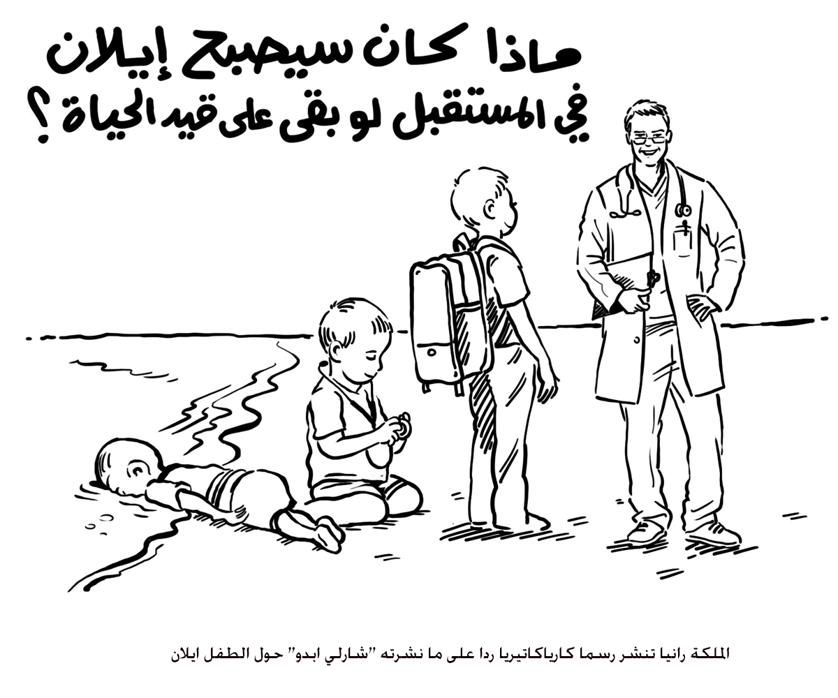 وعلقت جلالتها على الرسم الكاريكاتيري الذي تم تنفيذه من قبل فنان الكاريكاتير الأردني اسامة حجاج، باللغات العربية والإنجليزية والفرنسية بقولها 'كان من الممكن ان يصبح ايلان طبيبا او معلما او ابا حنونا'.