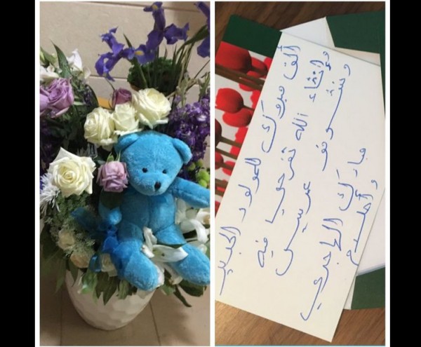 ونشرت فارس عبر تويتر صورة الهدية التي تلقتها من أحلام، وهي عبارة عن باقة من الورد ورسالة تهنئة كُتب عليها” ألف مبروك للمولود الجديد وانشاء الله تفرحي فيه وتشوفو عريس… مبارك الهاجري وأحلام”.