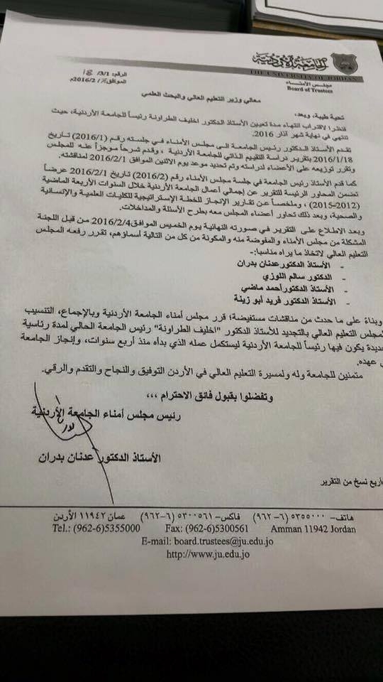 قرر مجلس أمناء الجامعة الأردنية وبالاجماع التنسيب لمجلس التعليم العالي بالتجديد للاستاذ الدكتور اخليف الطراونة رئيس الجامعة الحالي لمدة رئاسية جديدة يكون فيها رئيسا للجامعة الأردنية.