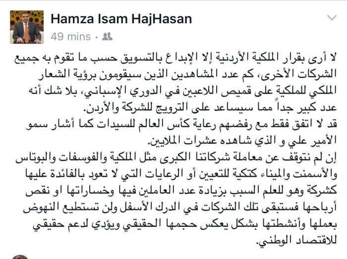 عبر مدير عام المجموعة الاردنية للمناطق الحرة والتنموية المهندس حمزة الحاج حسن عن اعتيادية استهجان سمو الأمير علي بن الحسين لرعاية الملكية الأردنية لفريق اسباني بمئات الآلاف من الدنانير، والتوقف عن دعم الاتحاد الأردني لكرة القدم.