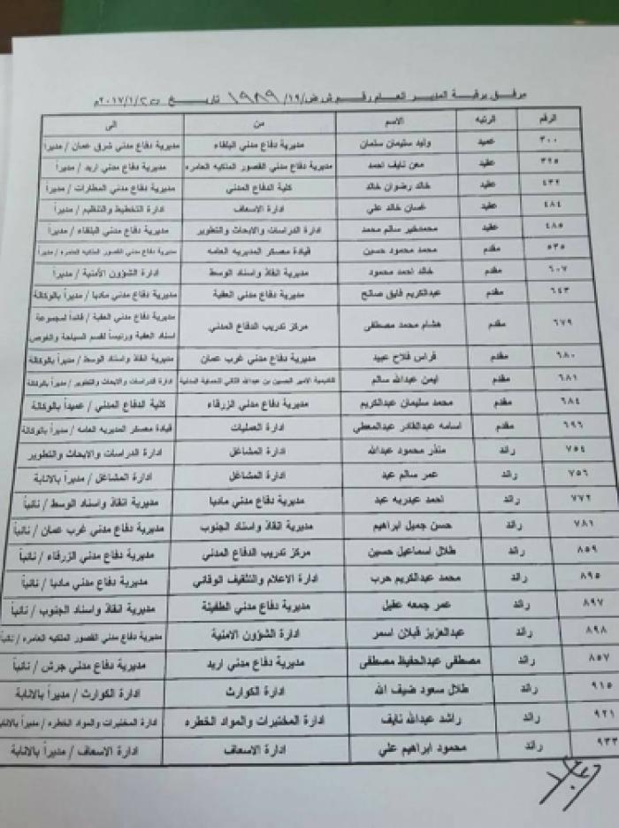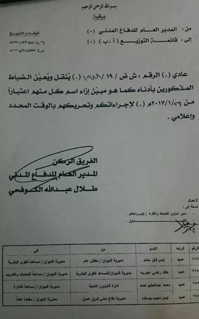 قرر مدير عام الدفاع المدني الفريق الركن طلال الكوفحي إجراء تنقلات شملت رتبة عميد وعقيد ومقدم ورائد على النحو التالي :