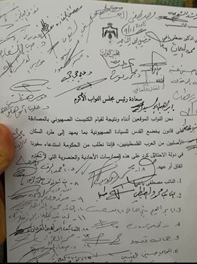 وقع 50 نائبا، اليوم الثلاثاء، مذكرة تطالب الحكومة باستدعاء السفير الأردني في تل أبيب، وليد عبيدات، احتجاجا على "ممارسات أحادية وعنصرية" لسلطات الاحتلال الإسرائيلي.