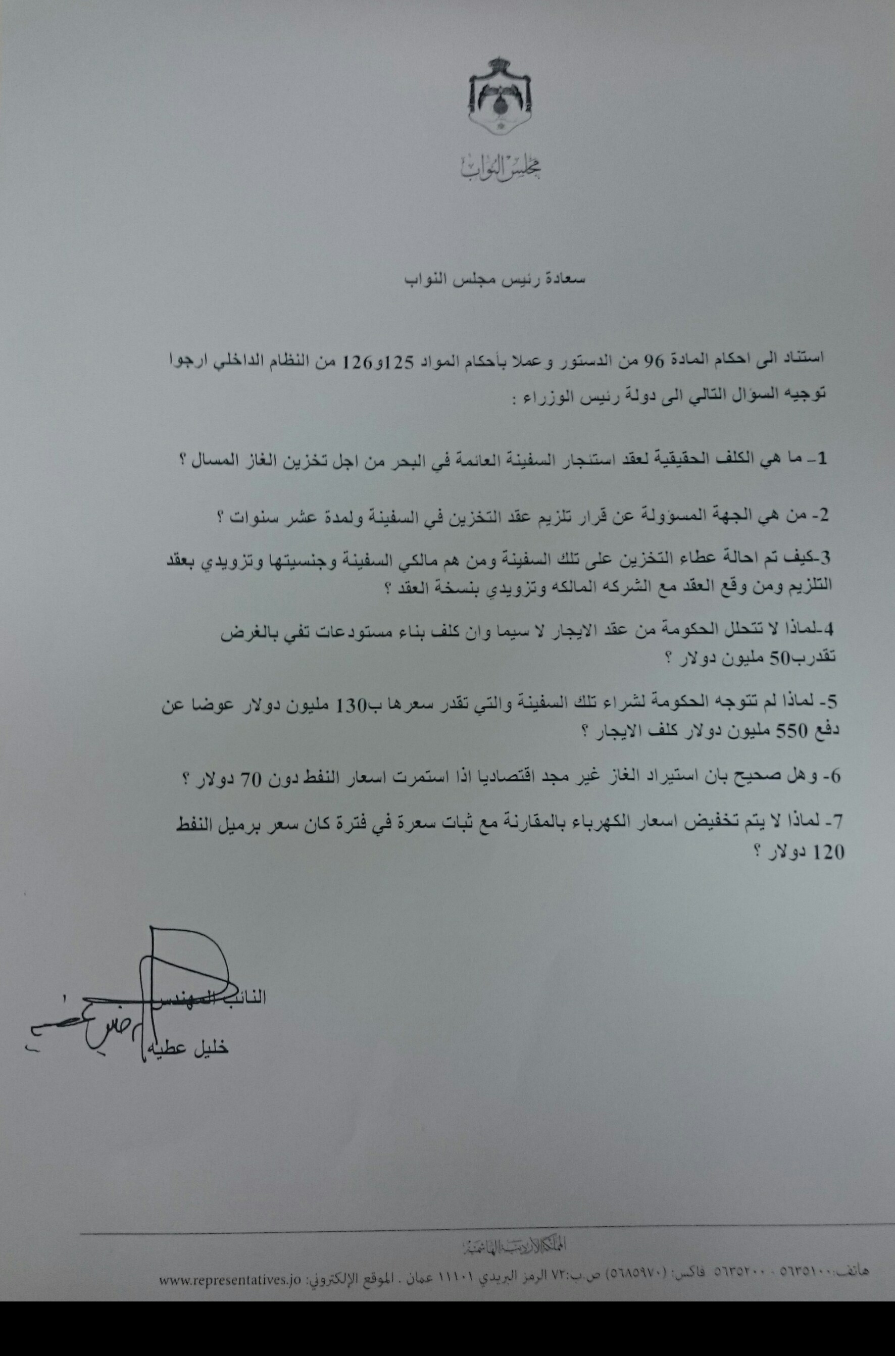 طالب النائب خليل عطية خلال سؤال نيابي وجهه لرئيس الوزراء الدكتور هاني الملقي بتزويده بنسخه من عقد استئجار السفينة العائمة في البحر من اجل تخزين الغاز المسال.