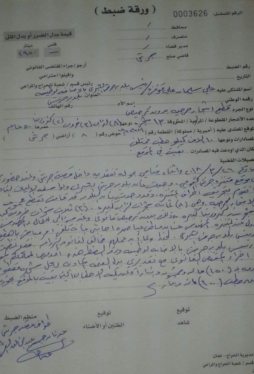 تغريم رئيس بلدية جرش 2950 دينار بسبب قطع أشجار عمرها 50 عام...وثيقة
