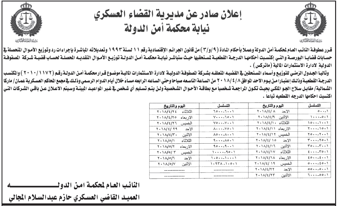 أسماء مستحقي الأموال النقدية المحصلة من شركة المصفوفة 'ماتركس'
