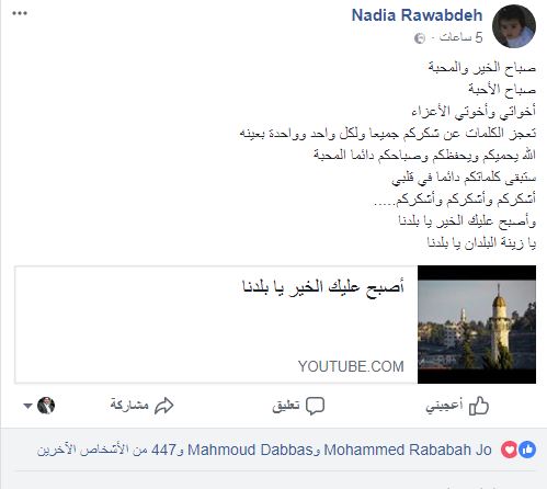 وقالت الروابدة عبر صفحتها على فيسبوك: " صباح الخير والمحبة، أخواتي وأخوتي الأعزاء، تعجز الكلمات عن شكركم جميعاً، ولكل واحد وواحدة بعينه، الله يحميكم ويحفظكم وصباحكم دائماً محبة، ستبقى كلماتكم دائماً في قلبي، أشكركم وأشكركم وأشكركم، أصبح عليك الخير يا بلدنا، يا زينة البلدان يا بلدنا".