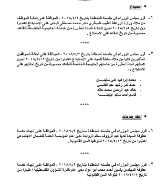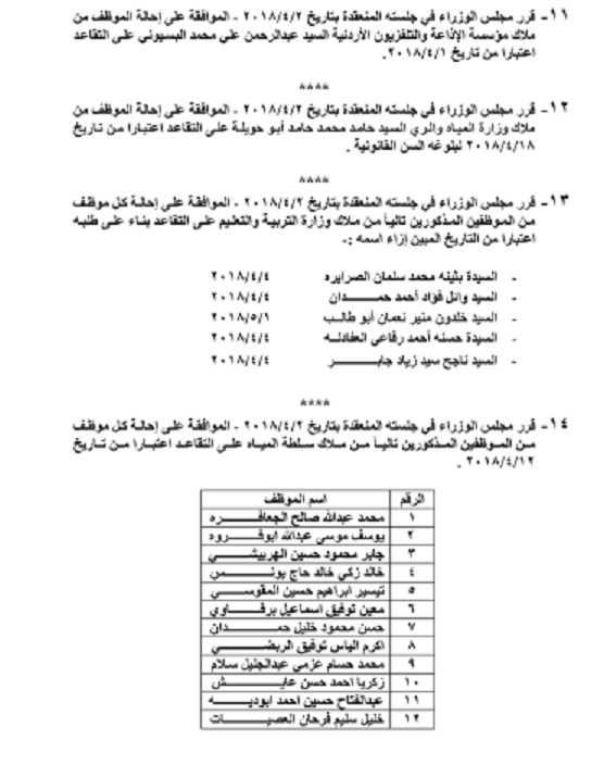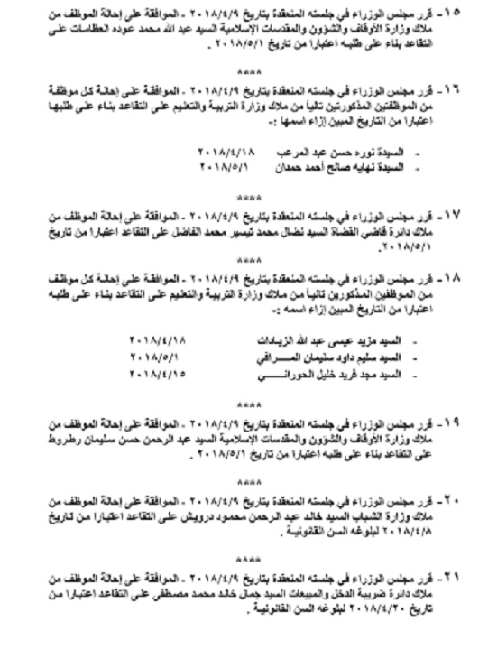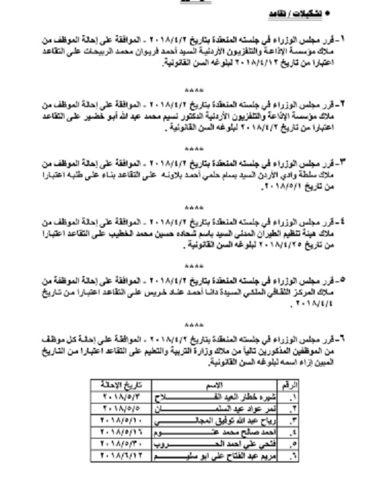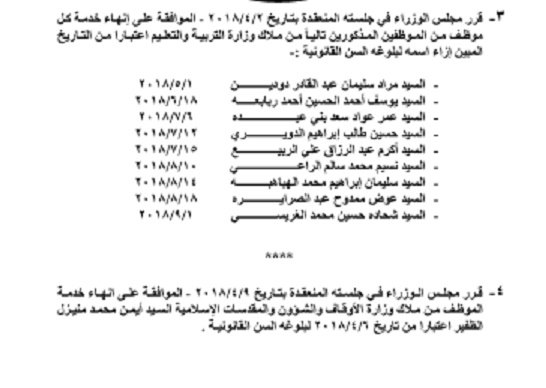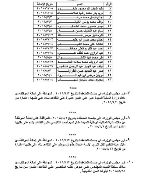 صدر في عدد الجريدة الرسمية اليوم الاثنين قرارات مجلس الوزراء بخصوص احالة عدد من الموظفين الى التقاعد وانهاء خدمات واستيداع آخرين.