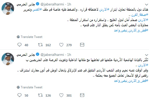 أشاد الاعلامي القطري المعروف جابر الحرمي بالقيادة الهاشمية والشعب الأردني في التعامل مع الاحداث الجارية في الأردن.