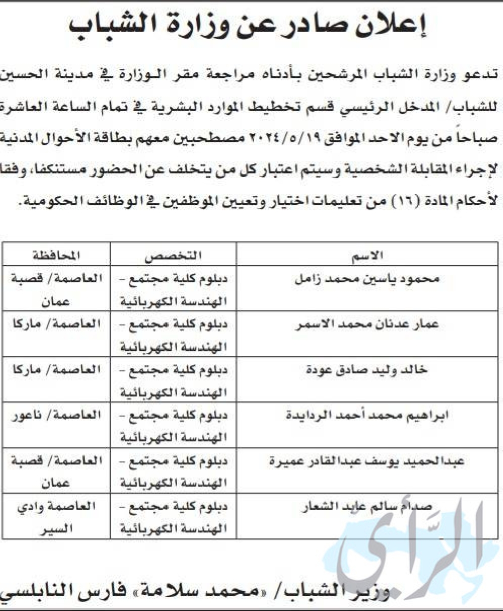 الراي نيوز - دعت عدداً من الوزارات والمؤسسات الرسمية بالتنسيق مع هيئة الخدمة الإدارة العامة اليوم الثلاثاء، مرشحين لإجراء المقابلات الشخصية واستكمال إجراءات التعيين.