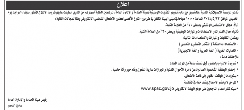 الزاي نيوز - دعت المؤسسة الاستهلاكية المدنية، المرشحين التالية أسماؤهم من الذين انطبقت عليهم الشروط، التواجد يوم الخميس الموافق ٢٠٢٤/٥/٢٣ في مبنى الهيئة الكائن في طبربور - شارع الأقصى لحضور الامتحان التنافسي الالكتروني وفقا لمجالات التالية:
