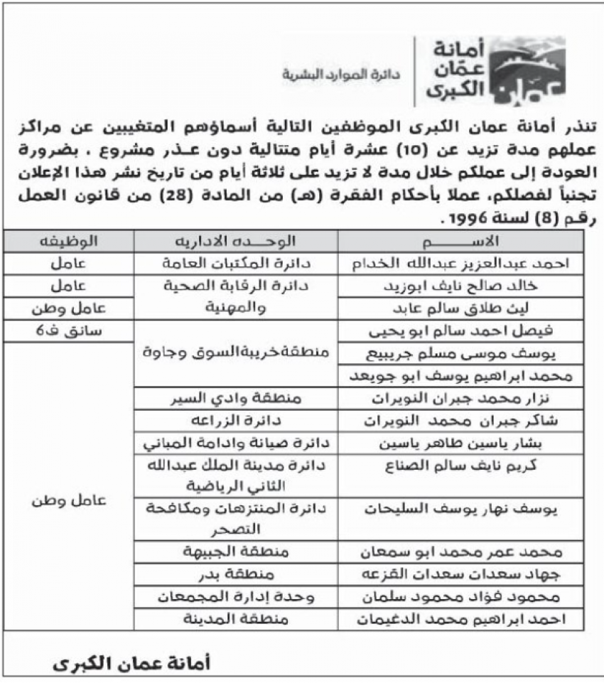 الراي نيوز - أنذرت أمانة عمان الكبرى، 20 عامل وطن وموظفا، بالعودة إلى عملهم خلال 3 أيام، وإلا سيتم فصلهم نتيجة تغيبهم عن العمل لمدة تزيد عن 10 أيام، وذلك عملا بأحكام الفقرة "هـ" من المادة "28" من قانون العمل رقم "8" لسنة 1996.