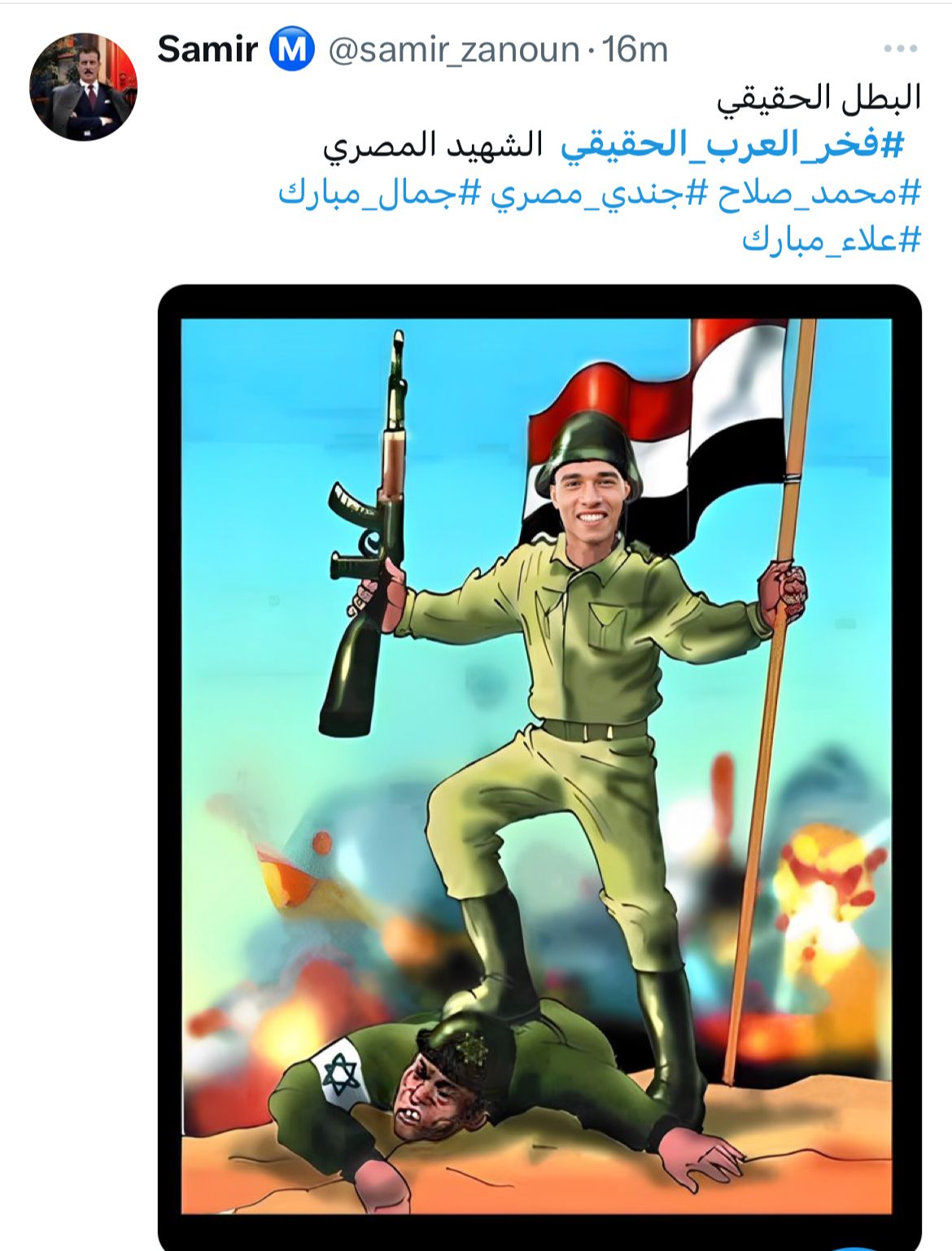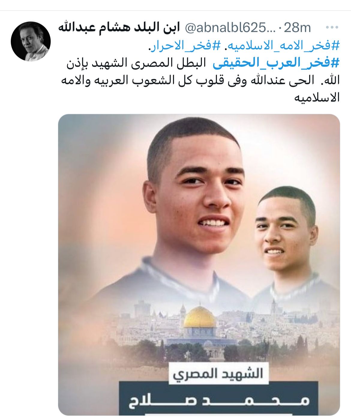 الراي نيوز- تصدر وسم فخر العرب الحقيقي منصة تويتر، اليوم الثلاثاء، ولقي الهاشتاغ تفاعل أردني وعربي واسع حيث أشاد المغردون بالموقف البطولي الذي صنعه الشهيد الجندي المصري محمد صلاح.