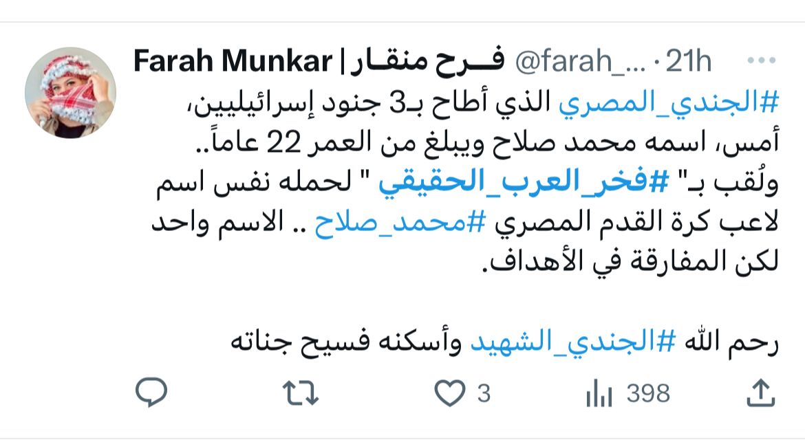 ويذمر أن الشهيد الجندي محمد صلاح والذي يبلغ من العمر 23 عامًا إرتقى بعد تصفية 3 جنود من الإحتلال وأصاب أخرين على الحدود المصرية الفلسطينية قبل أيام، فيما قامت بأنّ سلطات الاحتلال الإسرائيلي بتسليم السلطات المصرية، جثمان الشهيد يوم أمس