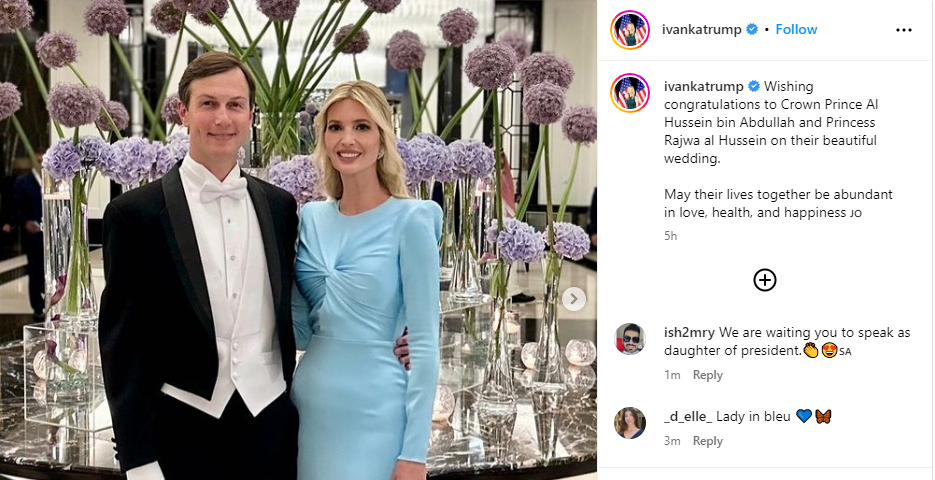 ونشرت ايفانكا عبر حسابها على انستغرام صورتين، الأولى جمعتها مع زوجها جاريد كوشنر، والثاني لولي العهد والأميرة رجوة الحسين.
