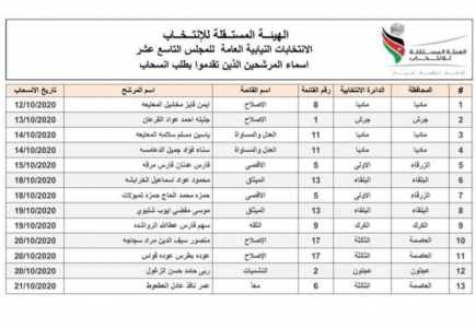 اعلنت الهيئة المستقلة للانتخاب عن اسماء المرشحين الذين تقدموا بطلب انسحابهم من انتخابات المجلس التاسع عشر وهم