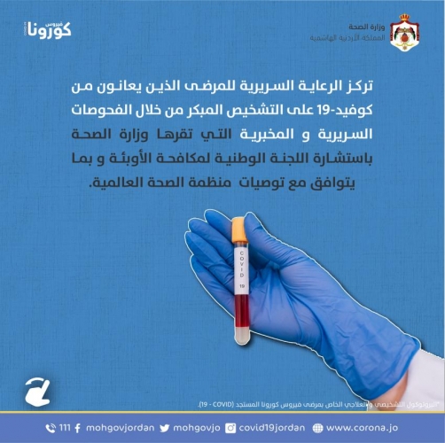 وقالت الوزارة، في منشور لها عبر حسابها على فيسبوك، الخميس، إن الرعاية السريرية للمرضى الذين يعانون من كوفيد-19 يتركز على التشخيص المبكر من خلال الفحوصات السريرية والمخبرية التي تقرها وزارة الصحة باستشارة اللجنة الوطنية لمكافحة الأوبئة بما يتوافق مع توصيات منظمة الصحة العالمية.