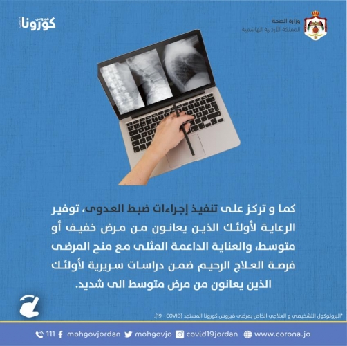 كما تركز على تنفيذ إجراءات ضبط العدوى وتوفير الرعاية للذين يعانون من اعراض خفيفة أو متوسطة، والعناية الداعمة مع منح المرضى فرصة العلاج ضمن دراسات سريرية للذين يعانون من أعراض متوسطة الى شديد.
